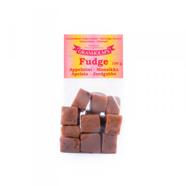 Fudge smaksatt med apelsinarom och torkade jordgubbar. bara naturliga lokala bär och frukter.