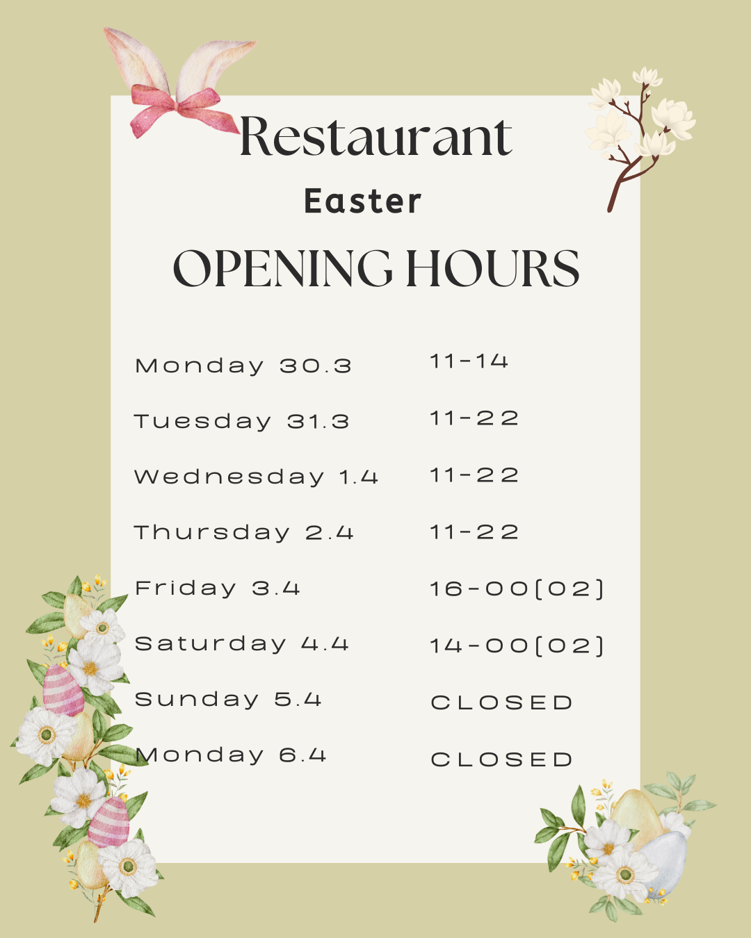 Monday 30.3: closed